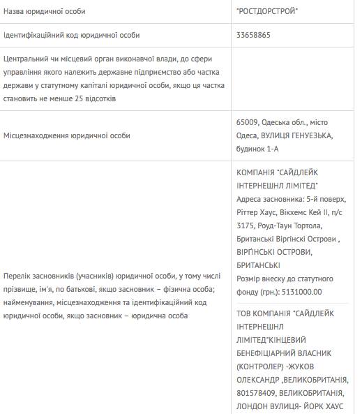Одна з них ТОВ «Ростдорстрой» зареєстрована на віргінський офшор «Сайдлейк інтернешнл лімітед», бенефіціаром якого у ЄДРЮО вказаний мешканець Лондона Олександр Жуков. У 2001 р. італійська поліція затримувала Жукова за підозрою в незаконній торгівлі зброєю. Його донька Дар’я є подругою життя російського мільярдера Романа Абрамовіча, якого вважають одним з «гаманців» Володимира Путіна.