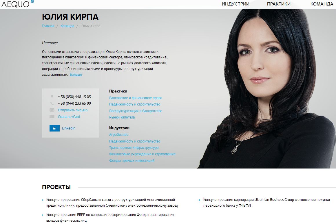 Ще один партнер AEQUO Юлія Кирпа входить до громадської ради при Нацбанку. Вона очолювала проект «Консультування корпорації Ukrainian Business Group щодо купівлі перехідного банку у ФГВФО», над яким працювали Олександр Терещенко та Богдан Дмуховський.