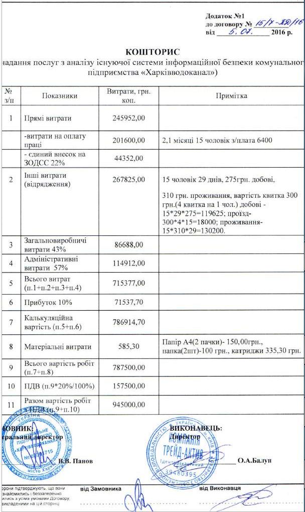КП «Харківводоканал» 5 липня уклало угоду з ТОВ «Компанія «Трейд-Актив» щодо надання послуг з аналізу існуючої системи інформаційної безпеки вартістю 945 тис. грн.