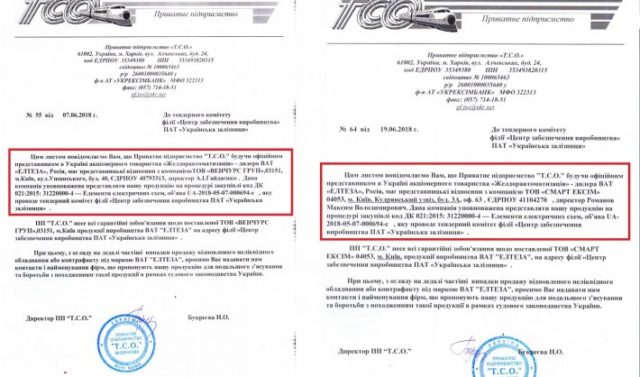 Обидві фірми подали аналогічний пакет документів з різницею в 2 хвилини. При цьому обидва учасники тендеру надали документи про те, що є офіційними представниками ПП «Т.С.О.», яке є представником в Україні російського виробника – ПАТ «Елтеза» (м. Камишлов, Свердловська обл., РФ).