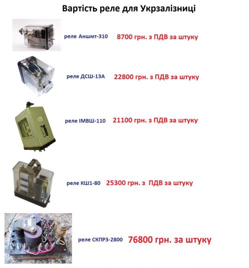 При цьому на російському ринку ціни на запропоновану «Укрзалізниці» продукцію на деякі товари втричі нижчі. Наприклад, ціна одного реле КШ1-80 за результатами тендеру склала 25 300 грн. Російська компанія «ВСП74» пропонує такі ж реле по 19 950 руб. (8 800 грн.). Тобто в 2,9 рази дешевше.