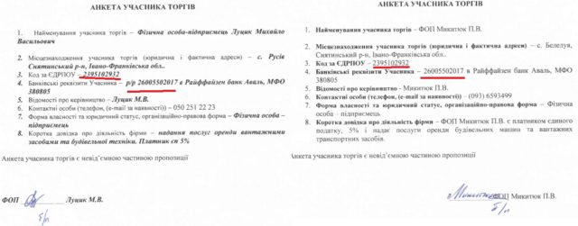 На старіших торгах на послуги з оренди автомобілів для «Калинівського ринку», Луцик та Микитюк не тільки подавали довідку з однаковими помилками. У довідці «Анкета учасника торгів» обидва учасника зазначили однаковий розрахунковий рахунок у одному і тому ж банку та ідентифікаційний код.